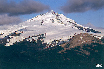 Comenzamos a subir el filo. Este sector de la travesía lo voy a recordar por siempre. En ese momento marchaba yo primero y me puse a trepar un talud de hielo tallando escalones con los pies. Sobre mi cabeza no se adivinaba más nada y ardía de curiosidad por saber qué encontraría al llegar. Me asomé a una especie de terraza y me volteó el blanco enceguecedor del Tronador. Íntegro, con todos sus glaciares. Sé que el paso del tiempo distorsiona tamaños y distancias, pero lo recuerdo increíblemente cerca, casi sintiendo su aliento frío en la cara.
